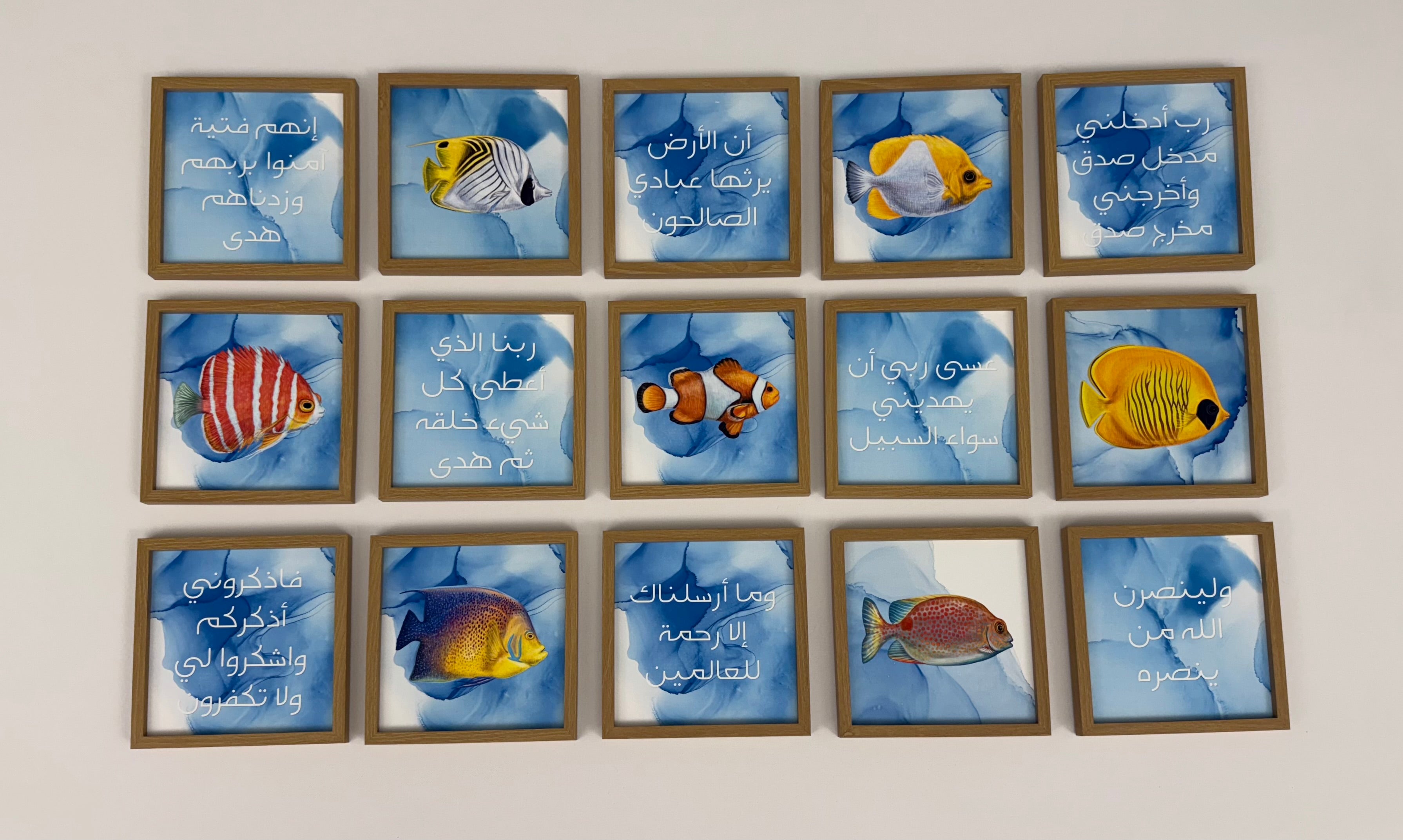 A set of 15 wood-finish frames.